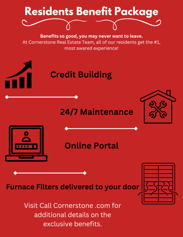 Many of our properties accept pets. All applicants must complete an Animal Profile for each animal in the household. If no animals will be present in the property, you must complete a "no pet" profile. A refundable deposit of $300 and monthly pet fee of $35 applies to all pets. We will make all accommodations for any certified Emotional Support Animals and/or Service Animals. Please have all certifications for the animal completed prior to submitting an Animal Profile. All documentation will be verified by a third party. Lastly, we deny any applicants with any felonies or evictions within the past 3 years, any debt collection from previous management companies, and any fraudulent documents. We do not accept violent felons or registered sex offenders. All Cornerstone Real Estate Team residents are enrolled in the Resident Benefits Package (RBP) for $14-$22 per month which includes HVAC air filter delivery (for applicable properties), credit building to help boost your credit score with timely rent payments, $1M Identity Protection, utility concierge service making utility connection a breeze during your move-in, our best-in-class resident rewards program, and much more! More details upon application. You can see all our available rentals at www.callcornerstone.com.
